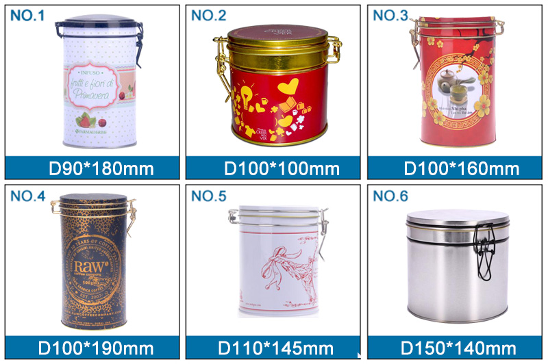 Luftdichte Tee-Kaffee-Metalldose mit Riegelverschluss, Größe: 100 * 160 mm, Es besteht aus Weißblechmaterial mit einer Dicke von 0,23 mm, CMYK-4-Farben- oder Panton-Druck. Wir unterstützen jede Anpassung.