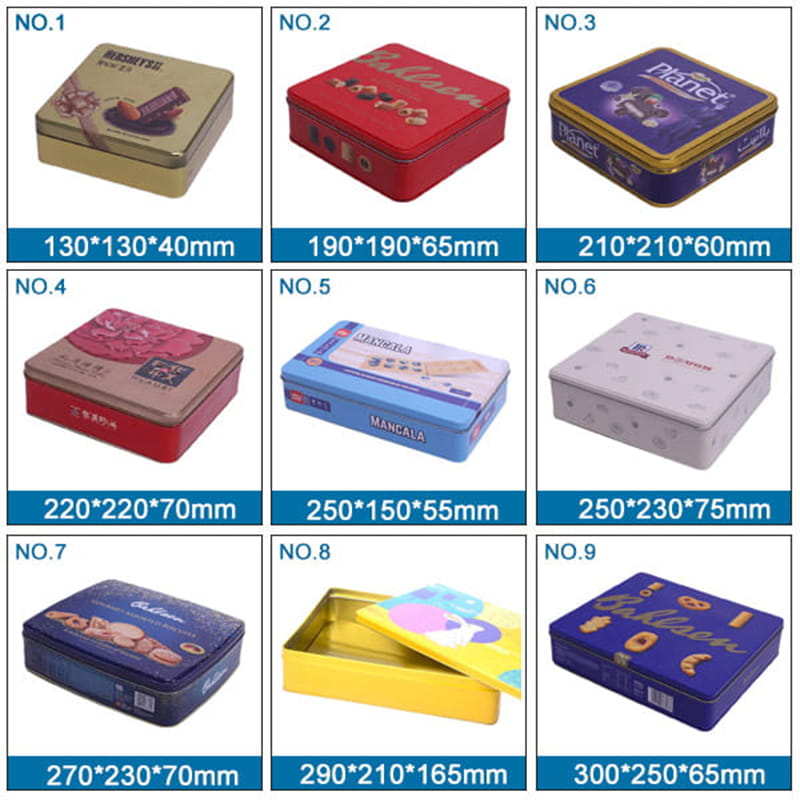 Das Blechdose aus Metall wird normalerweise für Süßigkeiten- und Schokoladenverpackungen verwendet, die Größe beträgt 220 * 220 * 68 mm, es besteht aus Weißblechmaterial mit einer Dicke von 0,23 mm, mit CMYK-4-Farben- oder Panton-Druck. Jetzt unterstützen wir Ihr individuelles Design und die Herstellung neuer Formen.