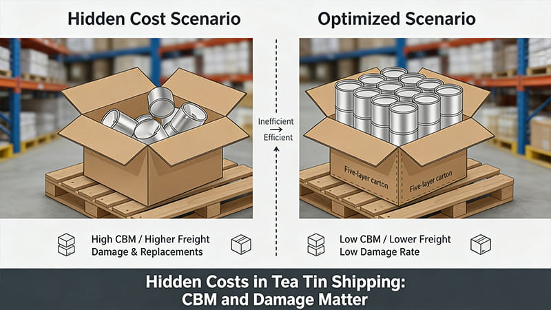 For custom tea tins, especially decorative or premium ones, freight is often driven more by cubic volume than by weight. Buyers who focus only on piece price and weight can miss the fact that a poorly optimized tin size or carton plan is effectively a decision to ship empty space.